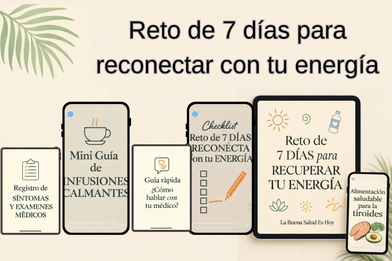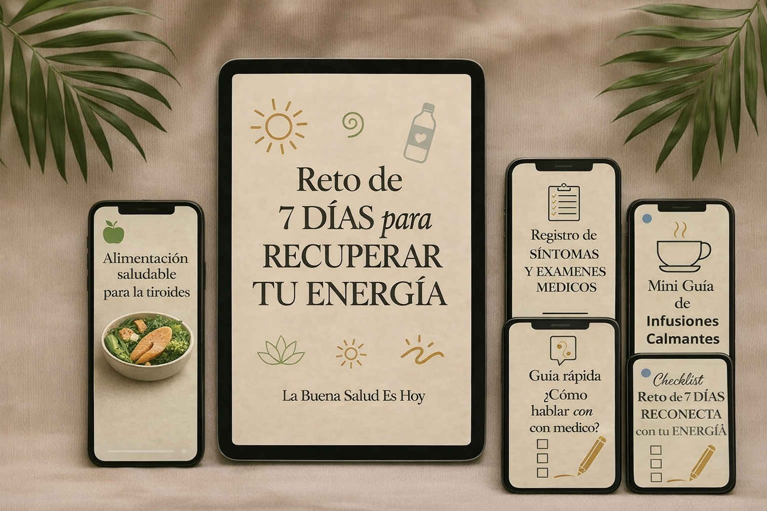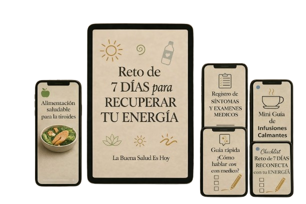 🎁 Incluye BONOS: Alimentación saludable para tu tiroides, Checklist Reto de 7 Días Reconecta con tu Energía, Guía rápida ¿Cómo hablar con tu médico, Mini Guía de Infusiones Calmantes,Registro de síntomas y exámenes médicos.