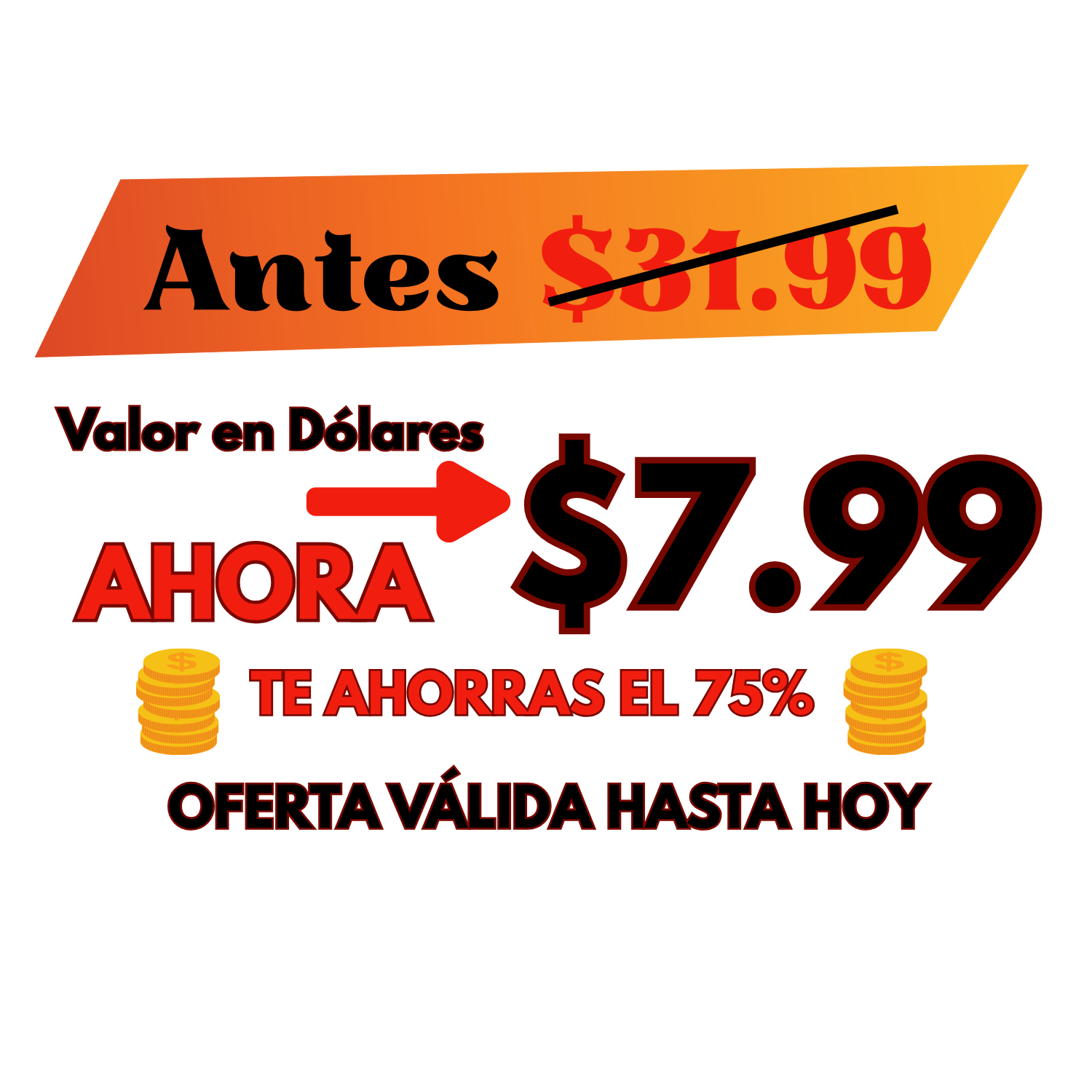 Si tomas acción en los próximos minutos HOY OBTIENES este SUPER DESCUENTO del 75%, para que no pagues los $ 31.99 que vale y pagues tan SOLO $ 7,99 Dólares que pagarás en tu moneda local.